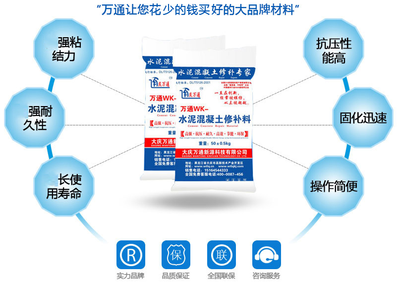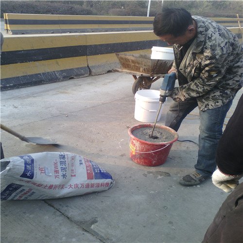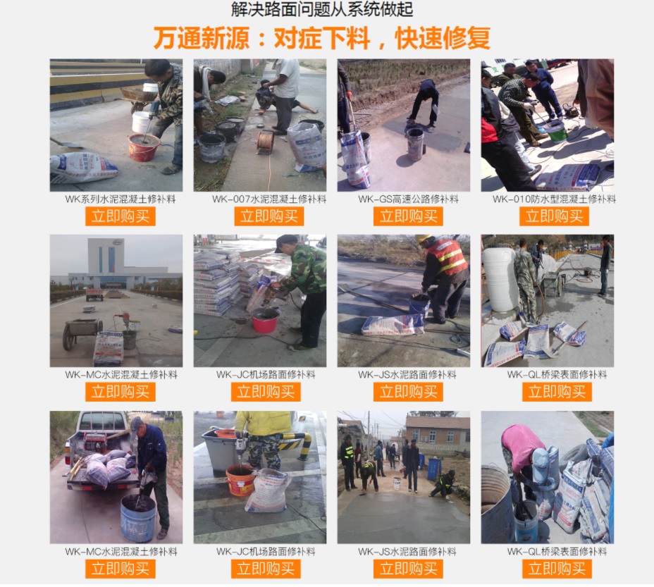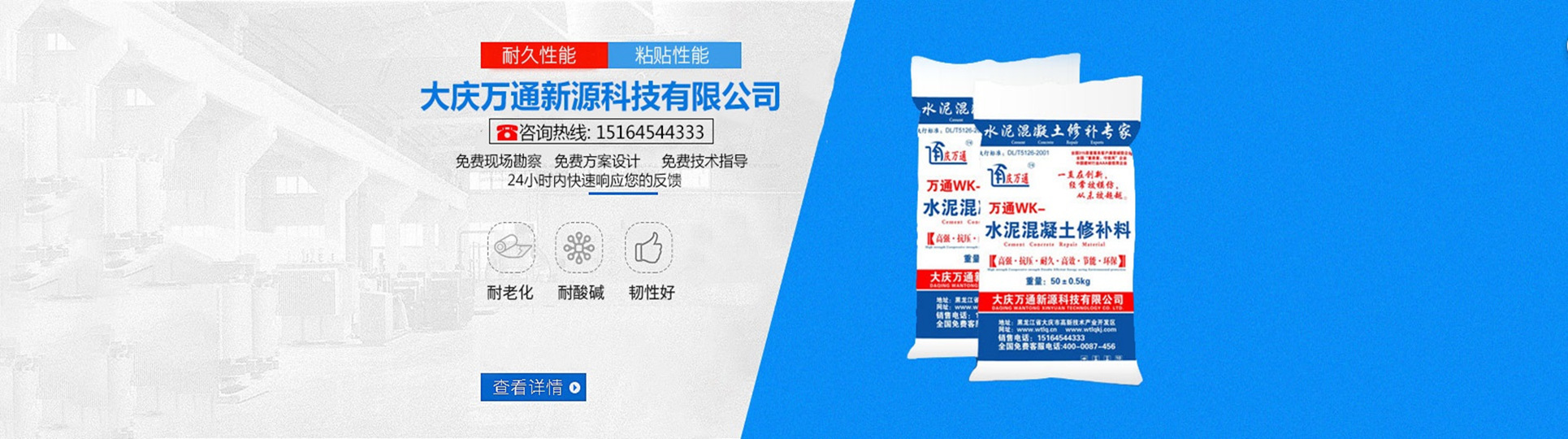 大慶萬(wàn)通新源科技有限公司獨(dú)有的混凝土路面高強(qiáng)速補(bǔ)料,是水泥混凝土路面病害修復(fù)的好材料。疲勞、凍融循環(huán)、彎曲壓力、滲水和基層破壞等原因都會(huì)引起水泥路面的破損,從而帶來(lái)高昂的維護(hù)費(fèi)用。與以往的剛性修補(bǔ)方法不同,混凝土水泥路面維修速補(bǔ)膠提供了一種獨(dú)特的柔性修補(bǔ)產(chǎn)品和技術(shù),高柔性、高抗拉性,可跨伸縮縫施工和高抗壓性使得混凝土快補(bǔ)產(chǎn)品為水泥混凝土路面提供了******性的修補(bǔ)。傳統(tǒng)的剛性修補(bǔ)方案,如環(huán)氧砂漿和快干水泥產(chǎn)品,由于其自身的粘結(jié)失效,抗疲勞性低以及與原路面不同的伸縮系數(shù),修補(bǔ)面會(huì)在短時(shí)間內(nèi)失效或產(chǎn)生新的裂縫,需要反復(fù)修補(bǔ),有效期短且費(fèi)用高昂。大慶萬(wàn)通新源科技有限公司的混凝土水泥路面維修速補(bǔ)膠可以隨原路面一起伸縮,移動(dòng),從而避免了粘結(jié)失效和產(chǎn)生新裂縫。萬(wàn)通快補(bǔ)產(chǎn)品優(yōu)異的粘結(jié)性、柔韌性和高防滑性,特別適用于水泥路面的淺層粘合修補(bǔ),多邊角混凝土板層修補(bǔ),跨伸縮縫修補(bǔ)以及路面沉陷修補(bǔ)。萬(wàn)通混凝土病害修補(bǔ)料針對(duì)混凝土起皮起沙、斷板裂縫、蜂窩麻面、坑槽露石子、漏筋掉皮、橋梁的掉皮漏筋快速通車(chē)使用時(shí)間長(zhǎng)。應(yīng)用萬(wàn)通快補(bǔ)產(chǎn)品,施工后一天就可以恢復(fù)交通。大慶萬(wàn)通新源科技有限公司的萬(wàn)通水泥路面維修速補(bǔ)膠適用于高速公路、機(jī)場(chǎng)路面、農(nóng)村村村通路面、廠坪、學(xué)校操場(chǎng)、市區(qū)公路、小區(qū)路面、橋梁、水泥路面的修補(bǔ)。使用萬(wàn)通特快補(bǔ)材料修補(bǔ)路面可以一勞永逸! 水泥地面起砂怎么辦,混凝土修補(bǔ)劑混凝土地面起砂,混凝土地面修補(bǔ),地面起砂怎么辦,
